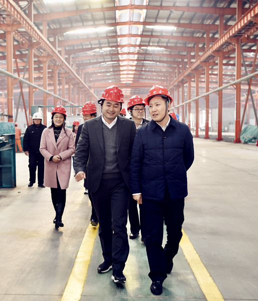圖為蔣書記在公司周董的陪同下參觀和檢查弘溧新材料有限公司