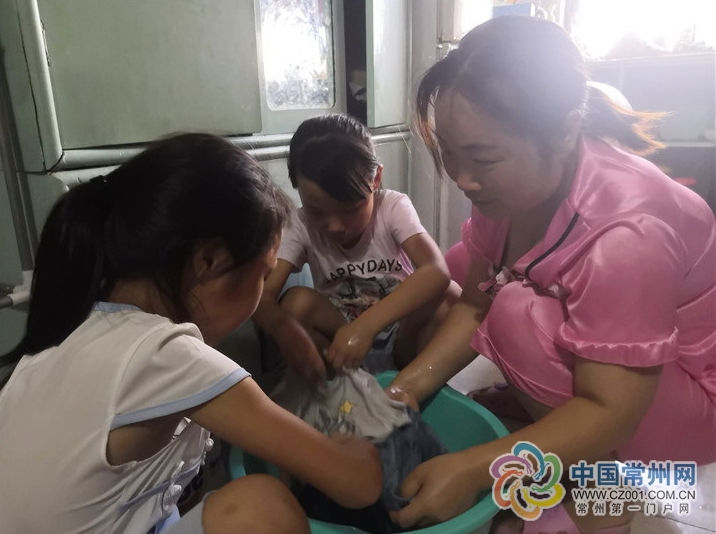 陳鋒的兩個女兒在幫媽媽洗衣服